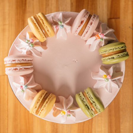 Queque pequeño con colores especiales y detalles adicionales como macarron (6 unidades). Puedes pedir el color que desees y con gusto te cotizamos. Varios sabores disponibles.